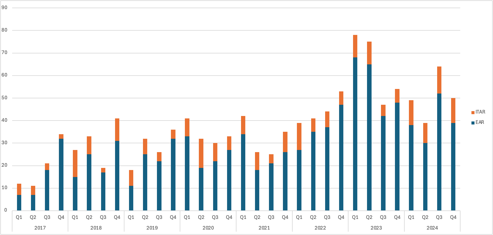 Export control professionals often ask, “Am I overreacting, or are the rules changing faster than ever?” You’re not imagining it. The graphic below tracks every Federal Register entry tied to either the Export Administration Regulations (EAR) or the International Traffic in Arms Regulations (ITAR) since 2017. Quarterly totals that once hovered in the teens now regularly pass 60 notices per quarter—and that count doesn’t even touch Office of Foreign Assets Control (OFAC) actions or Customs & Border Protection (CBP) tariff‑related measures.